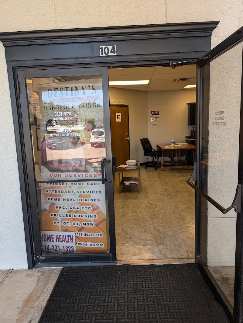 Destiny's Home Health Care is a licensed home health agency based at 337 Oaks Trail, Suite 104 in Garland, providing in‑home nursing and therapy services across Garland, Dallas, Fort Worth, Rowlett, Rockwall, Mesquite, DeSoto, Lancaster, and Arlington. The agency offers skilled nursing visits, physical therapy, speech therapy, home health aide support, homemaker services, and personal attendant or caregiver services for clients who need help remaining safely at home. Traditional Medicare, Texas Medicaid, VA Veteran Affairs, Molina Medicaid Attendant Services, and Superior Medicaid Attendant Services are accepted, making care accessible for many veterans and seniors in the area. Families can expect coordinated, in‑home clinical and supportive care designed to maintain health, support rehabilitation, and help loved ones stay in their own homes as long as possible.